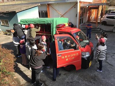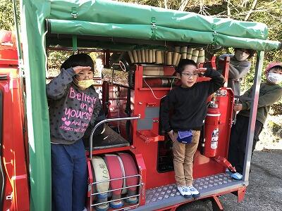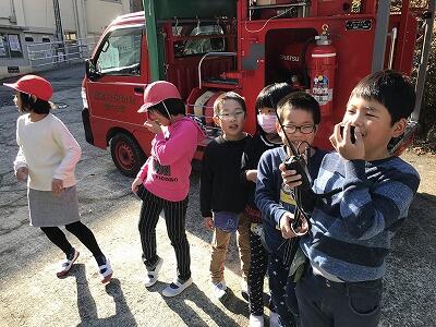 避難後は、火災の際に気をつけることについてのお話していただいたあと、積載車を見せていただき、子どもたちは、実際に乗せていただいたり、ホースを触ったりさせていただき喜んでいました。また、実際に使っている無線も使わせていただき、離れた場所から無線を使って、友だちとの通信を楽しんでいました。