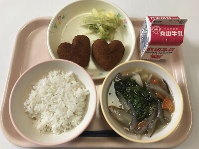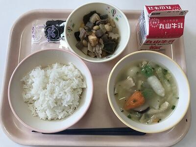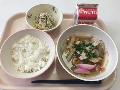 献立は、麦ご飯、雑煮、五目豆、牛乳でした。↓