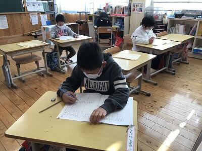 今日は、現在の学年で学習した内容の定着度を確かめる「CRT」学力検査を、2.3校時に行いました。国語の聞き取りから始まり、算数までみっちり2時間のテストでした。みんな時間いっぱいがんばりました。