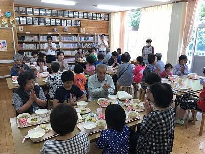 給食は、おじいちゃん、おばあちゃん、地域の高齢者の方々と一緒に食べました。