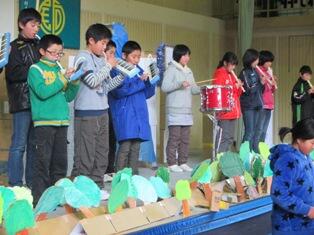 ・ 8日は学習発表会です。3学期が始まると、どの学級もその準備や練習をはじめました。写真は、その練習風景の一こま、高学年の合奏です。