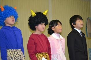 ・ 8日には学習発表会を開催し、児童一人一人がこれまでの成長ぶりをご披露しました。当日はとても寒い日でしたが、保護者の方をはじめ、地域の方々も大勢集まっていただき、とてもありがたく思いました。写真は、1年生の劇の一場面です。