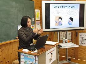 養護教諭の先生による1・2年生合同の授業が行われました。手洗い・うがいの大切さや、正しいやり方を学びました。薬品を手に塗り、いつもの手洗いをしてなぞの機械にかざしてみると、「あらあら洗い残したところが光っている!」ということから、いつもの手洗いで足りないところが分かりました。しっかりと手洗い・うがいをしてインフルエンザ等のウィルスから体を守りましょう。