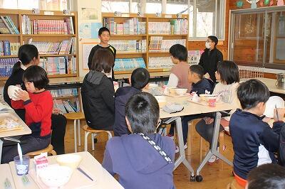 1月から、給食を全校児童で一緒に食べています。今回のハッピー誕生会は、給食中に行いました。