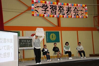 はじめに、外国語学習で学んだ英語を使った劇「桃太郎」を披露しました。また、椎葉村学で学んだ椎葉村の複合型農業についての発表もしました。農業体験で様々なことを感じたことが分かりました。