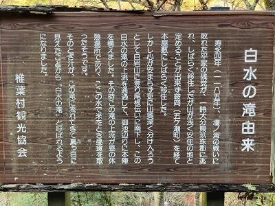 平家落人伝説の残る「白水(しらみず)の滝」といいます(詳しくは3枚目の写真をどうぞ)。紅葉の中を流れる滝を撮影しましたので紹介します。残念ながら紅葉のピークは過ぎてしまっていたようですが、紅葉の中を流れる水は美しいものでした(春の桜も美しいようです)。