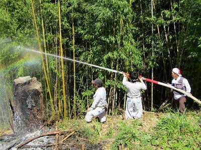 雲ひとつない青空の下、夏の猛烈な日差しと燃える炎の熱で大変な暑さの中でしたが、公民館長さん、副館長さんをはじめ、保護者、青年団、椎葉村の消防団等多くの方々のご協力のお陰で無事に終えることができました。