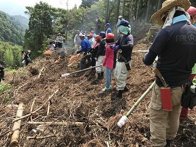 前日、前々日と夕立が続いたので、燃えるかどうかが心配されましたが、前日に消防団員の皆様、保護者の協力により燃えやすくなるようにと、倒木や杉葉の裏返し作業をしていただいたお陰で無事に火も入り、終えることができました。