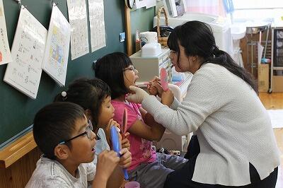 いい歯の日にちなんだ取組として、養護教諭が、毎日給食後に数人ずつ、子どもたちを保健室に招き、仕上げ磨きをしてくれています。