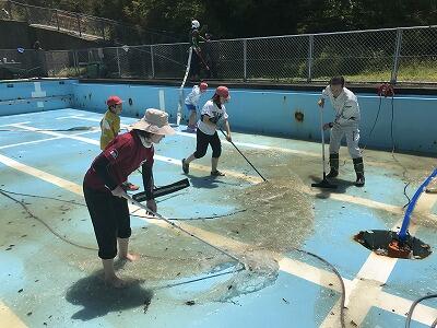 3・4年生はプールサイドをデッキブラシを使って、汚れを落とし