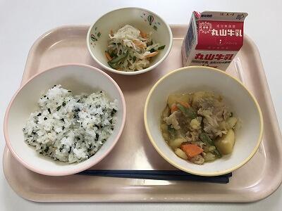 今日の給食は、さけわかめご飯、肉じゃが、千切り大根のピリ辛和え、牛乳でした。