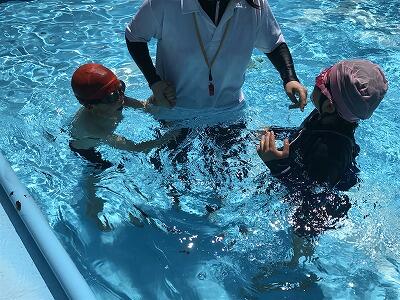 【1年生の二人も、小学校のプールに初めて入りました】↑