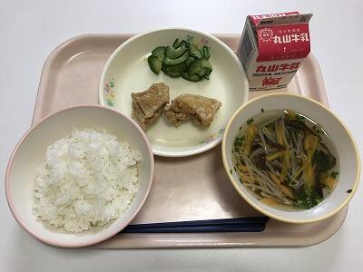 今日の給食は、麦ご飯、鶏肉のカレー揚げ、添えきゅうり、五目スープ、牛乳でした。