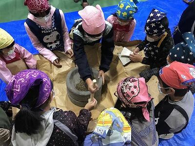 【そばづくり体験の様子 地域の方を講師として招いて指導していただきました。 昔の石臼を使って、収穫したそばを挽きます】↓