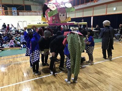 【1.2年生の発表 ※獅子舞に頭を噛んでもらったり、御神輿の下をくぐったりして幸せをたくさんもらいました】↓