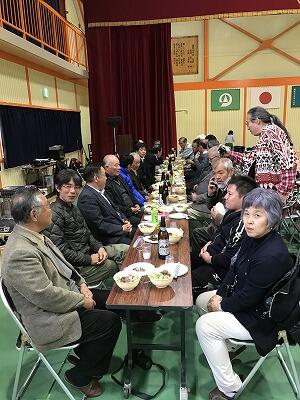 【焼畑そばの試食会の様子 焼畑で収穫したそばはもちろんのこと、お母さん方が前日からたくさんの干し椎茸を煮込んでくださったおかげで、焼畑そばに合う出汁と、刻んだ柚の風味、お父さん方が焼いて下さった、猪肉も入っていて、世界一美味しいそばをいただくことができました。】↓