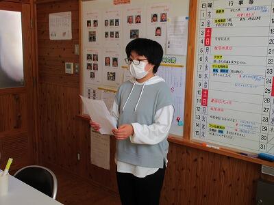 その中の「子どもの声を聞く会」で、6年生児童が作文を発表しました。「自慢の尾向とこれからのわたし」という題名で、尾向小の焼畑体験学習や森の遊園地での活動、自分の将来の夢について話しました。