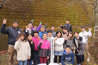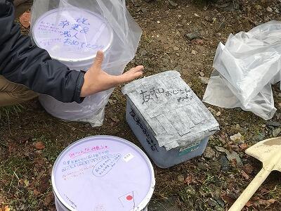 事前に保護者の方がショベルカーで穴を掘って下さっていたので、それぞれの思い出の品や成人式のお祝いで開封するお酒等も一緒に埋めたあと、最後に標柱を立てて終わりました。
