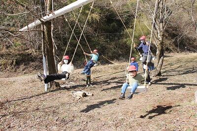 到着後、班ごとに森の遊園地のシーソーやブランコ、すべり台、ジップラインで遊びました。時間を忘れるほど夢中になって遊んでいました。