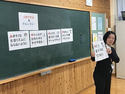 【こころ担当、まなび担当、からだ担当の先生方から冬休みの過ごし方についてのお話がありました】↓