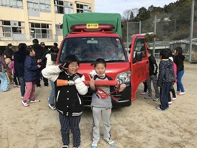避難後は、火災の種類や、火災の際に気をつけることや予防についてのお話、消火器の使い方を指導していただいたあと、積載車を見せていただき、子どもたちは、実際に乗せていただいたり、ホースを触ったりさせていただき喜んでいました。