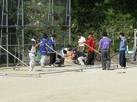 いよいよ明日に迫った尾向小・向山児童館・尾向公民館合同運動会に備えて、朝早くから保護者や地区の皆さん、青年団の方々に来ていただき、前日準備が行われました。準備は手際よく進み、瞬く間に素晴らしい会場ができあがりました。本当にありがとうございました。その後は、子ども達の鼓笛隊やリレーの最終練習を和やかに参観されていました。