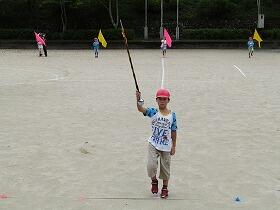 いつもなら先頭に立つ上級生についていけばよい部分もあるのですが、今回は3・4年生が先頭でリードし、しっかりと代役を務めていました。旗を振る役目の1年生も自分たちの立ち位置や動きを覚え必死に走っていました。