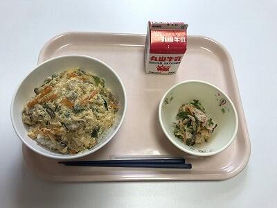 今日の給食は、親子丼、千切り大根の酢の物、牛乳でした。 ご飯の上にかかったフワフワの卵がとても美味しかかったです。