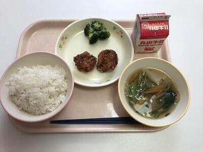 今日の給食は、麦ご飯、ワンタンスープ、鶏のから揚げ、添えブロッコリー、牛乳でした。鶏のから揚げは、子どもたちも大好きな献立です。お肉にしっかりと味が付いていて、ホクホク、ジューシーで美味しくいただきました。