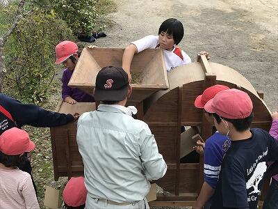 【学校に戻り、刈り取った蕎麦をシートの上で、歌を歌いながら棒で叩きあやした後、昔の道具の唐箕(とうみ)を使い蕎麦の実とそれ以外のものとに仕分けします。】↓