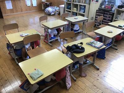 9月2日(火)地震想定の避難訓練を行いました。地震発生の放送を聞いて、素早く机の下に潜り、その後整然と運動場に避難しました。椎葉では、津波の心配はありませんが、土砂崩れや道路の決壊で孤立することが想定されますし、海岸付近に出かけているときには、津波も心配されます。避難する時の「お は し も」と、「津波てんでんこ」について話をして、いつ何時起こるやも知れぬ地震に備えて、自分の身を守る方法を日頃から身に付けておくことの大切さを学びました。