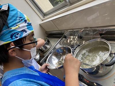 今回は、「ごはんとみそ汁」です。ふだんからお手伝いをしている子が多いようで、慣れた手つきで調理する様子が見られました。料理は「自立」の第一歩ですね。
