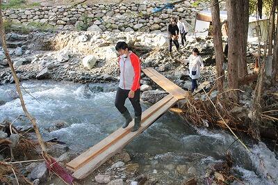 2.こちらも被害が大きかった追手納(おてのう)地区です。道路が約50m以上にわたって崩落し、集落が一時孤立しました(追手納に行くにはこの道しかありません)。消防団の皆さんを中心に、歩いて通れる道を整備されました(職員が歩いている2枚の写真)。その後、砂防ダムの上を通れる道が仮設道路として整備され、子どもたちが登校できるようになりました(重機を使っている写真)。消防団をはじめ地元の皆様のパワーに脱帽です。↓