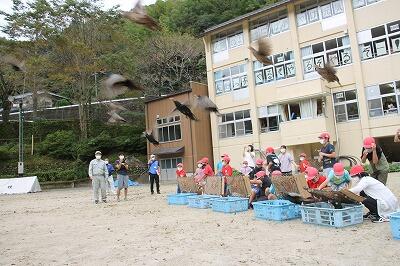 宇納間(美郷町北郷)で育てられた50羽ほどのキジが届けられ、子どもたちの手で放たれました。