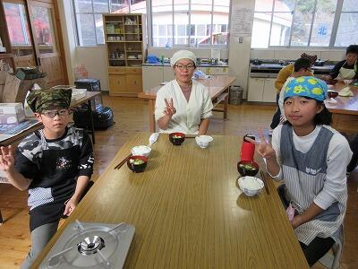 ごはんとみそ汁をつくりました。みそ汁は、いりこからだしをとり、いろいろな具材を入れて完成させました。ごはんは、透明の鍋を使って炊き上がる様子を観察しました。