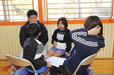 次に、全校みんなで遊ぶときにどんなことに気を付ければよいかを考えました。「みんなが楽しめるルールを考える」「失敗した人を責めない」など、グループでいろいろな意見を出しました。