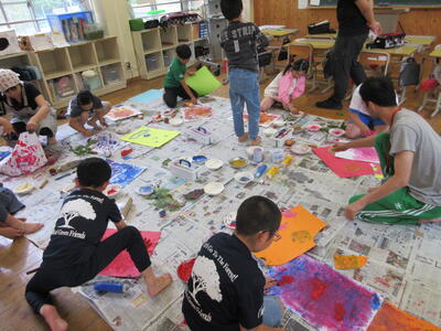 森のアーティスト3名の指導のもと、3・4年生の図工の授業が行われました。森のアーティストとは、椎葉で暮らしながら創作活動を行っている方々です。スポンジやシダの葉に絵の具をつけて塗るなど、様々な道具を使って、画用紙に絵を描いていきました。発想を広げて、画用紙からはみ出るくらい大胆に描いていました。中には、自分の体にまで絵の具をつけながら、楽しそうに活動をしていました。