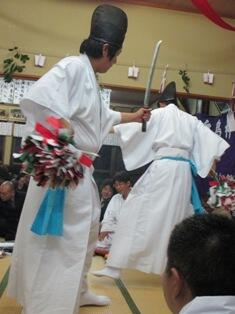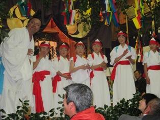・ 13日(土曜日)は尾前神楽でした。ここでは、小学生はもちろん、中学生も神楽を奉納しました。全員が寮生のため練習もあまり出来ていないと思いましたが、これまでの練習の成果が体に染みついているのでしょうね。さすが、上手でした。私たち尾前上班が組みうちだったため準備から片付けまで頑張りました。私は、主に一晩中外で火の番をして、妻は中でまかないのお手伝いをしました。また、CDを寄贈して下さったI先生も来て下さり、なんと神楽を舞われました。