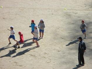 ・ 今日は「雲一つない青空」でした。真っ青な青空の下で、3,4年生が体育でサッカーのような運動をしていました。この写真は、その様子を三階から撮ったものです。楽しそうでした。