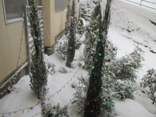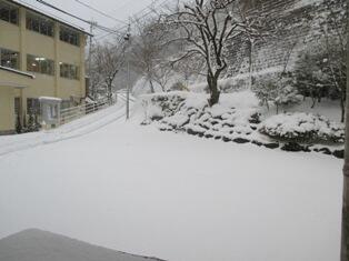 ・ 夕べからしとしとと降り続いた雪は、今朝、5時頃には尾前地区でもかなり積もっていました。写真は運動場、玄関前、コニファーガーデンの様子です。