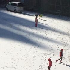 ・ 21日夜から22日朝にかけて、またまた雪が降りました。今回はそこまでは積もりませんでしたが、尾前地区の郵便局前の道路が写真のとおりです。それにしても今年の冬はよくふります。写真は運動場で遊ぶ児童です。