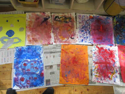 床に新聞紙を広げて、発想を広げて作品作りに取り組みました。
