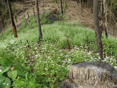 9月14日(月)焼畑のそばの様子を見に行きました。夏休みに行った時には、まだ草丈が30㎝ぐらいでまばらな感じでしたが、9月になり草丈も70㎝程度に成長し、白い花が満開となっていました。