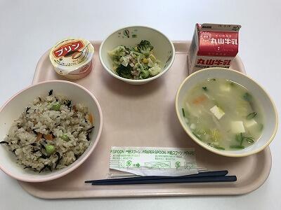 今日の給食は、山菜おこわ、シューマイ、添え野菜、わかたけ汁、牛乳でした。