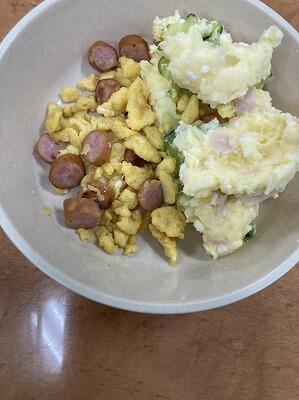 今回は、ポテトサラダとスクランブルエッグを作りました。