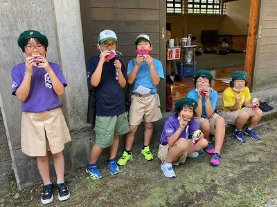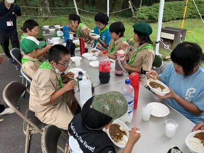 その他、食事作りやキャンプファイヤー、グリーンチャレンジを体験することができ、充実した2日間となりました。他の団体(東大宮小みどりの少年団)との交流もでき、よい思い出ができたようです。1日目の夕食はカレー、2日目の朝食はみそ汁でした。主催者によると、コロナウイルス感染症や台風の影響で、キャンプができたのは5年ぶり、キャンプファイヤーは8年ぶりだったそうです。今年は2日間とも素晴らしい天候に恵まれました。