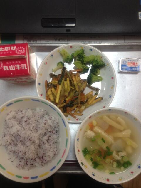 金曜日・・麦ご飯、だご汁、がね、ブロッコリー、チーズ