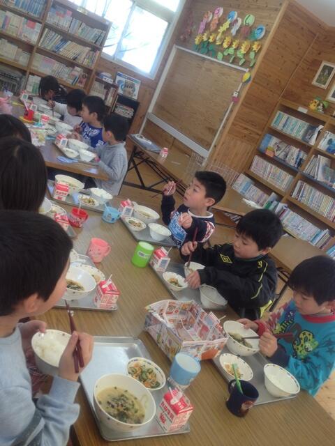 ・ 今日は、1、2年が多目的ルームで一緒に給食をいただきました。いつもは1年生も行う給食当番ですが、今日は2年生が1年生の分もやってくれました。少しおしゃべりをしながら、楽しそうにいただいていました。今日のメニューは・・ご飯、担々麺、ツナサラダでした。