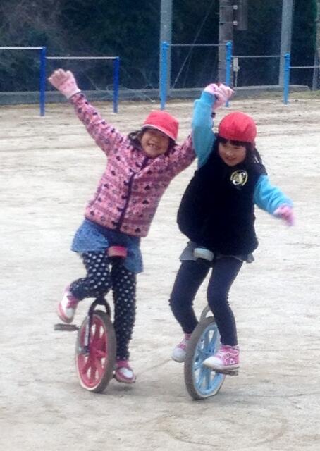 ・ 放課後や昼休みに一輪車に乗っている児童を見ます。鉄棒のところで練習をして、運動場を行き来する姿を見ます。特に女子が多いです。自分たちで練習をしているのですが、結構乗れる子供もいます。写真の子供は一年生です。すらすらと乗っていましたが、「写真を撮るよ。」といったとたん、ふらつき始めました。