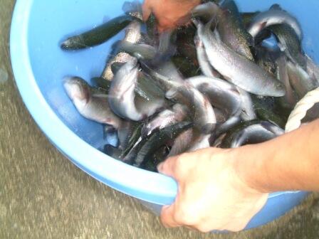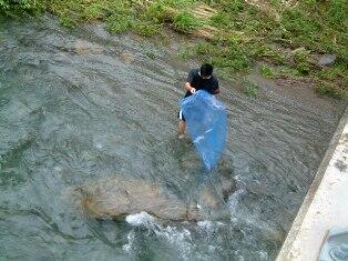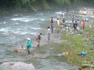 ・ 明日に備えて、今日は祭りの準備です。7時30分に役員の方々が学校に集合し、魚の放流や会場設営などをしています。写真は、にじます、やまめを川に放流しているところです。